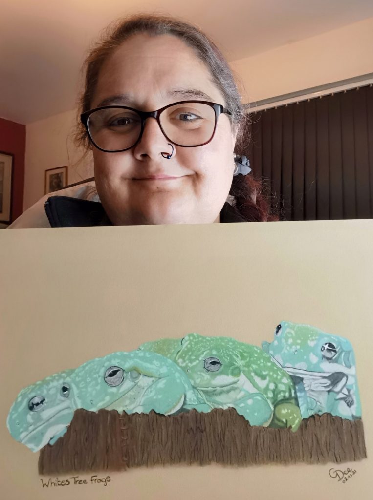 Although she loved creating commissioned artwork, the pressure of perfecting each piece became overwhelming. After stepping away for a break—which eventually stretched into a year—Dee took a leap in a completely new direction: drawing frogs. That single decision rekindled her joy in art, leading her to explore amphibians, fish, and other wildlife.