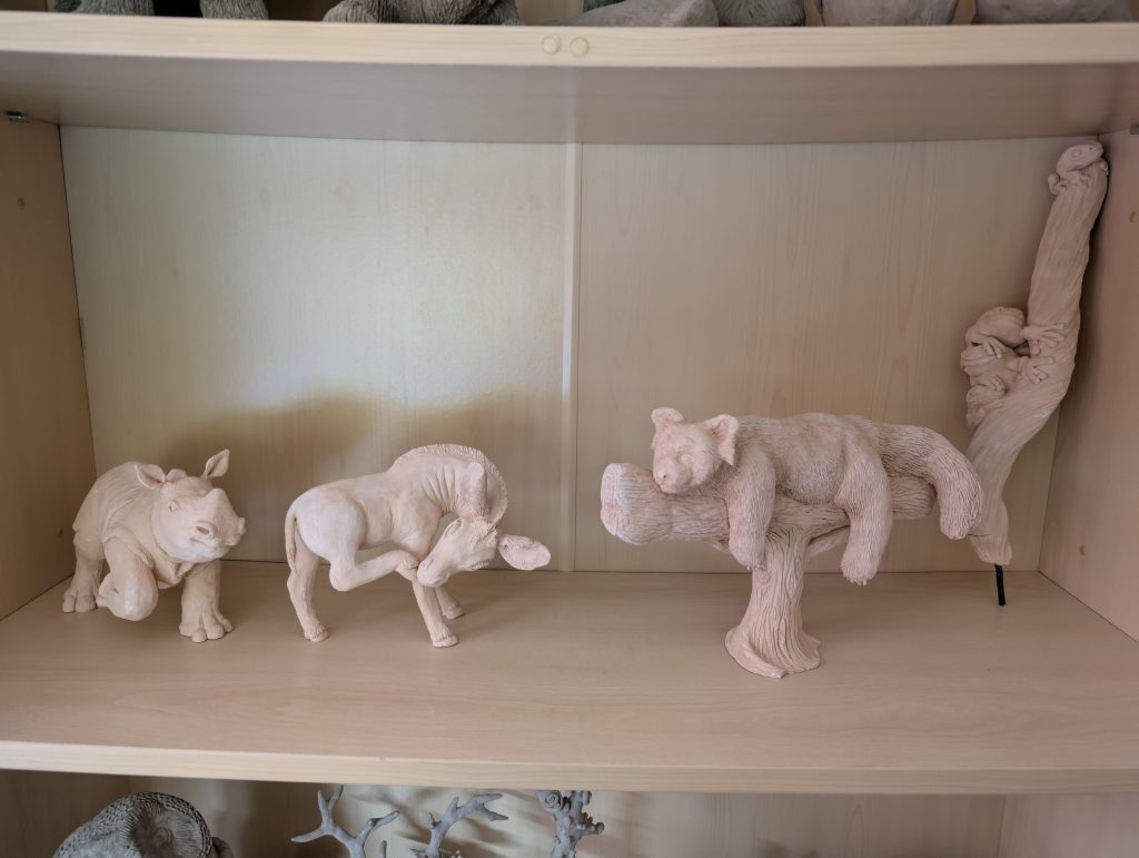 Tonight, I’ve glazed my first of the four sculptures that I fired!  I have started with the Rhino as I’m very limited on colours, but once I’ve got a few more colours I’ll get on with the rest. I can’t wait to paint the Okapi, it will look gorgeous once painted.  They are all being painted in matt glaze apart from the Tree Frogs which will have a natural wet look to them in the wild.