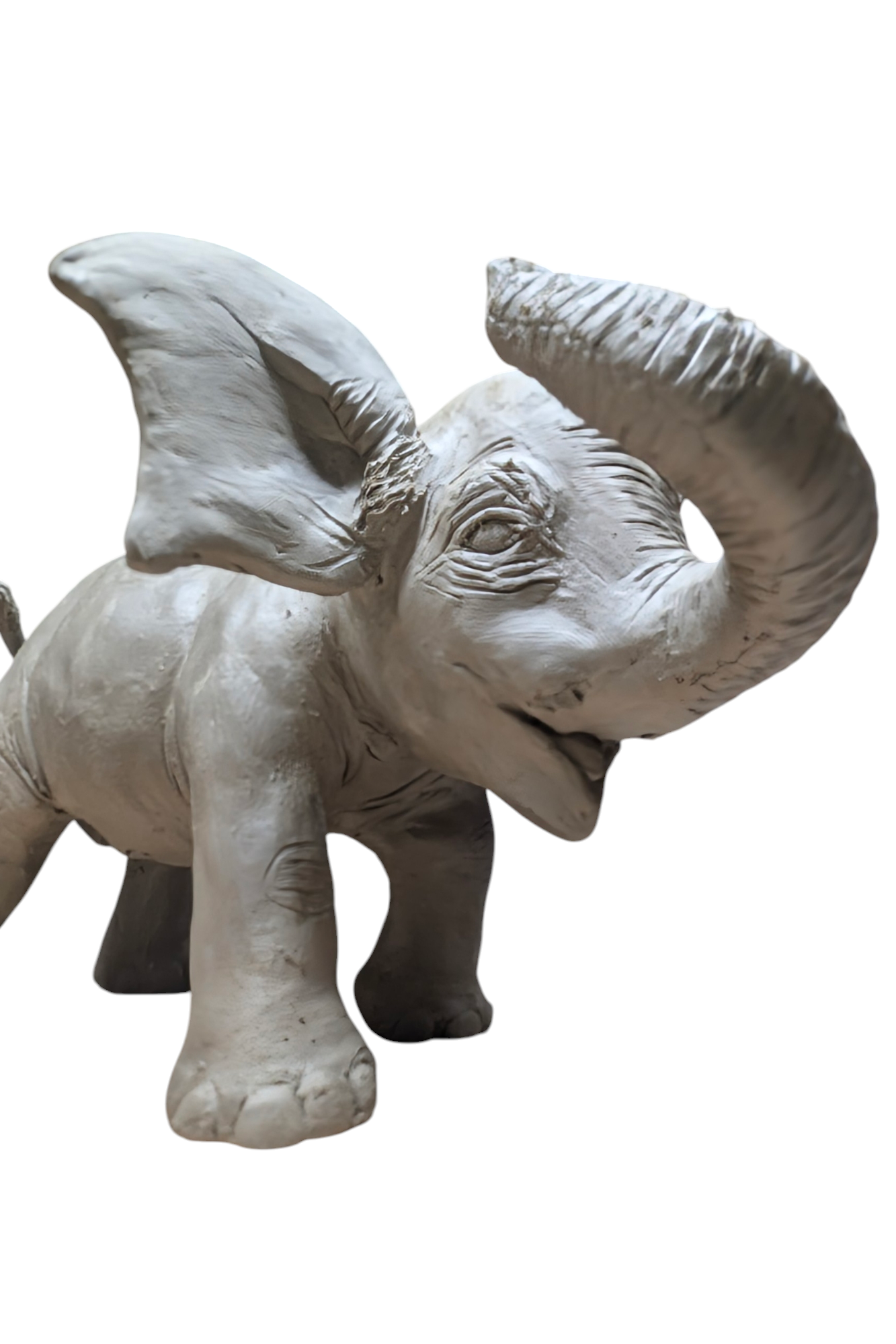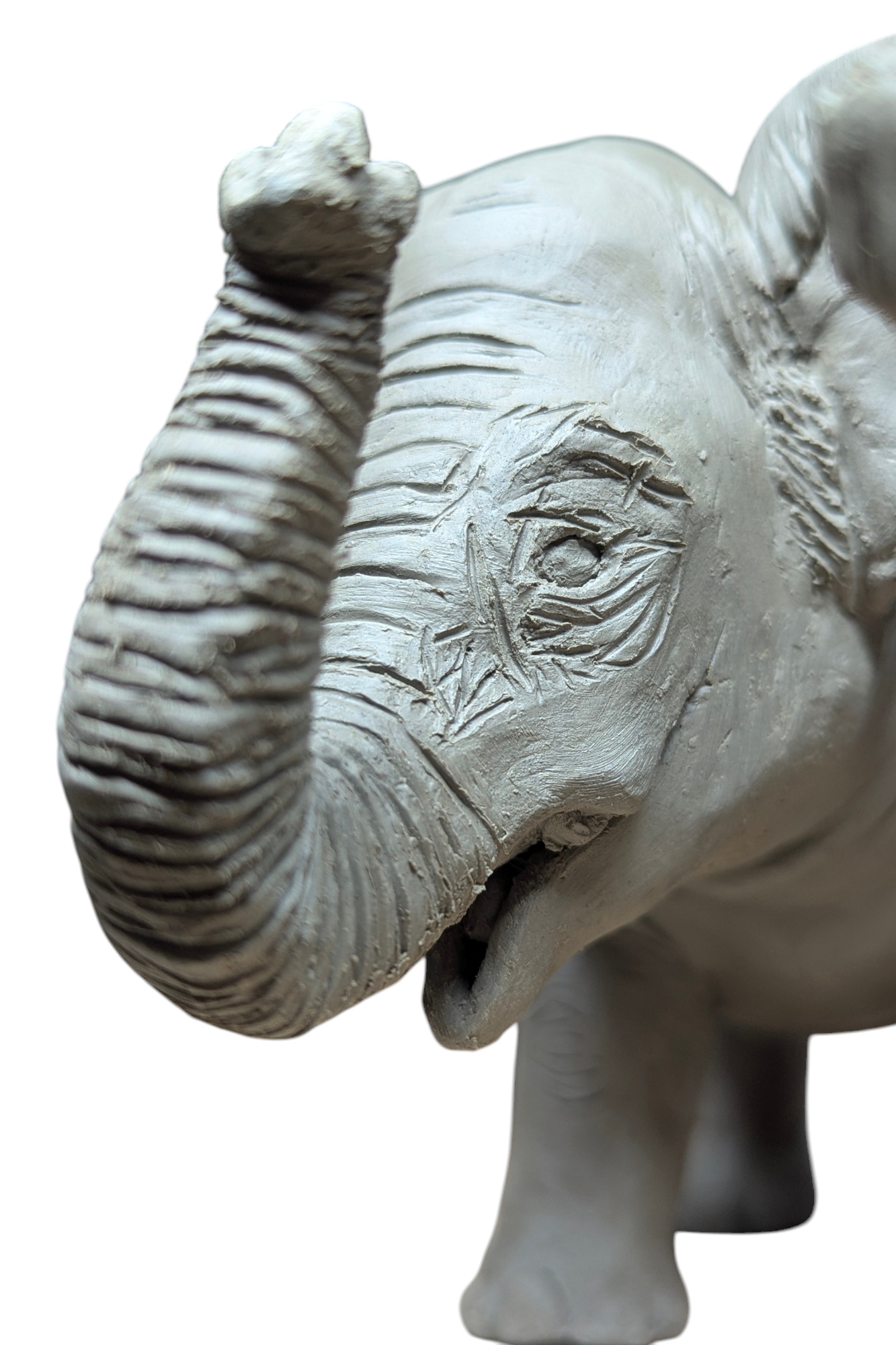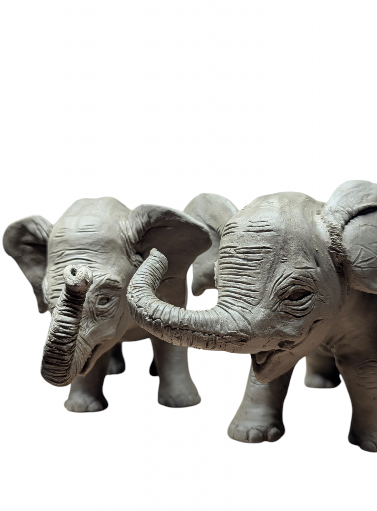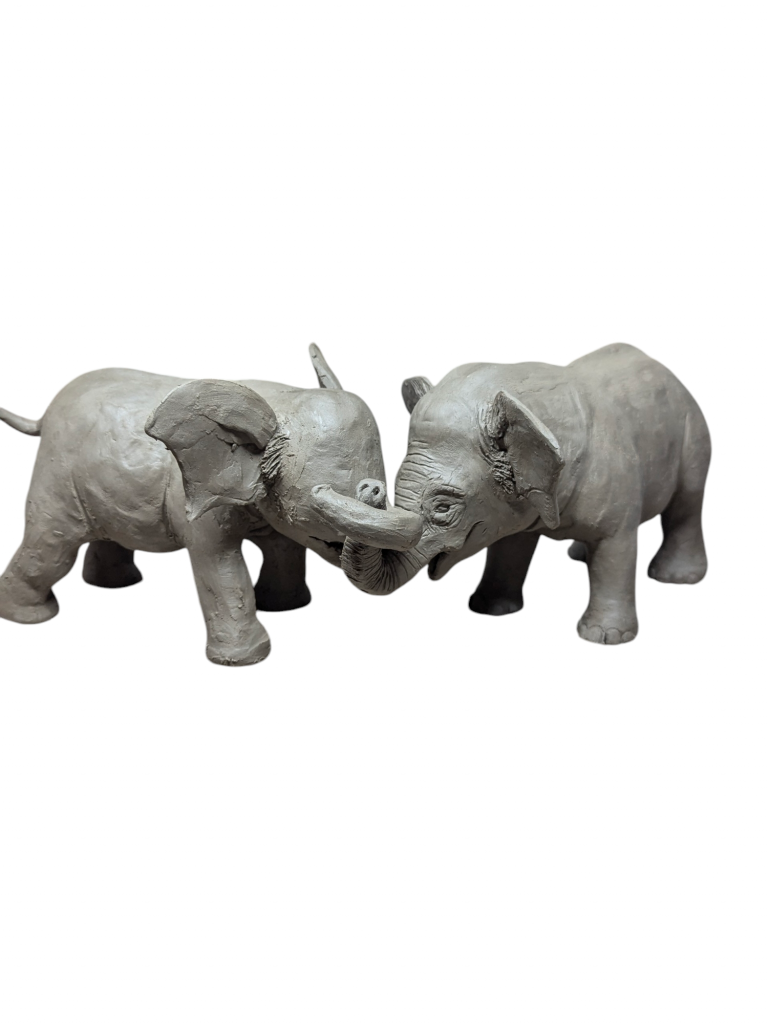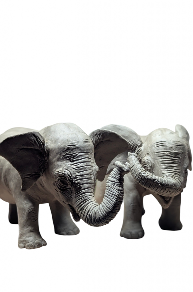 I chose to make a Sumatran Elephant Baby, however when I had completed the sculpture it just didn’t seem enough for such a huge majestic animal of such importance to this planet, so I made a second baby, I chose however to make them so they can stand apart or linked by their trunks to show their love for each other.