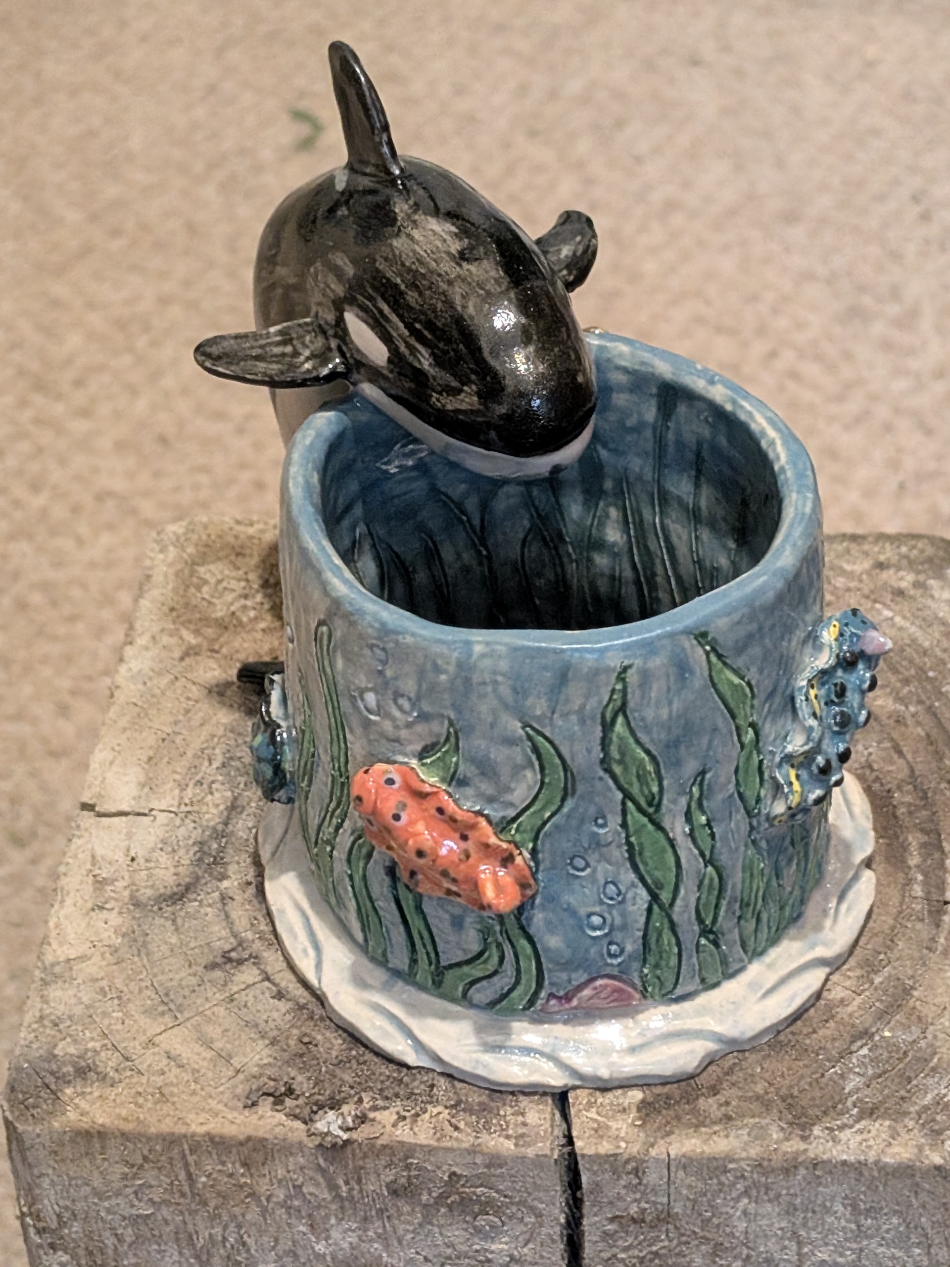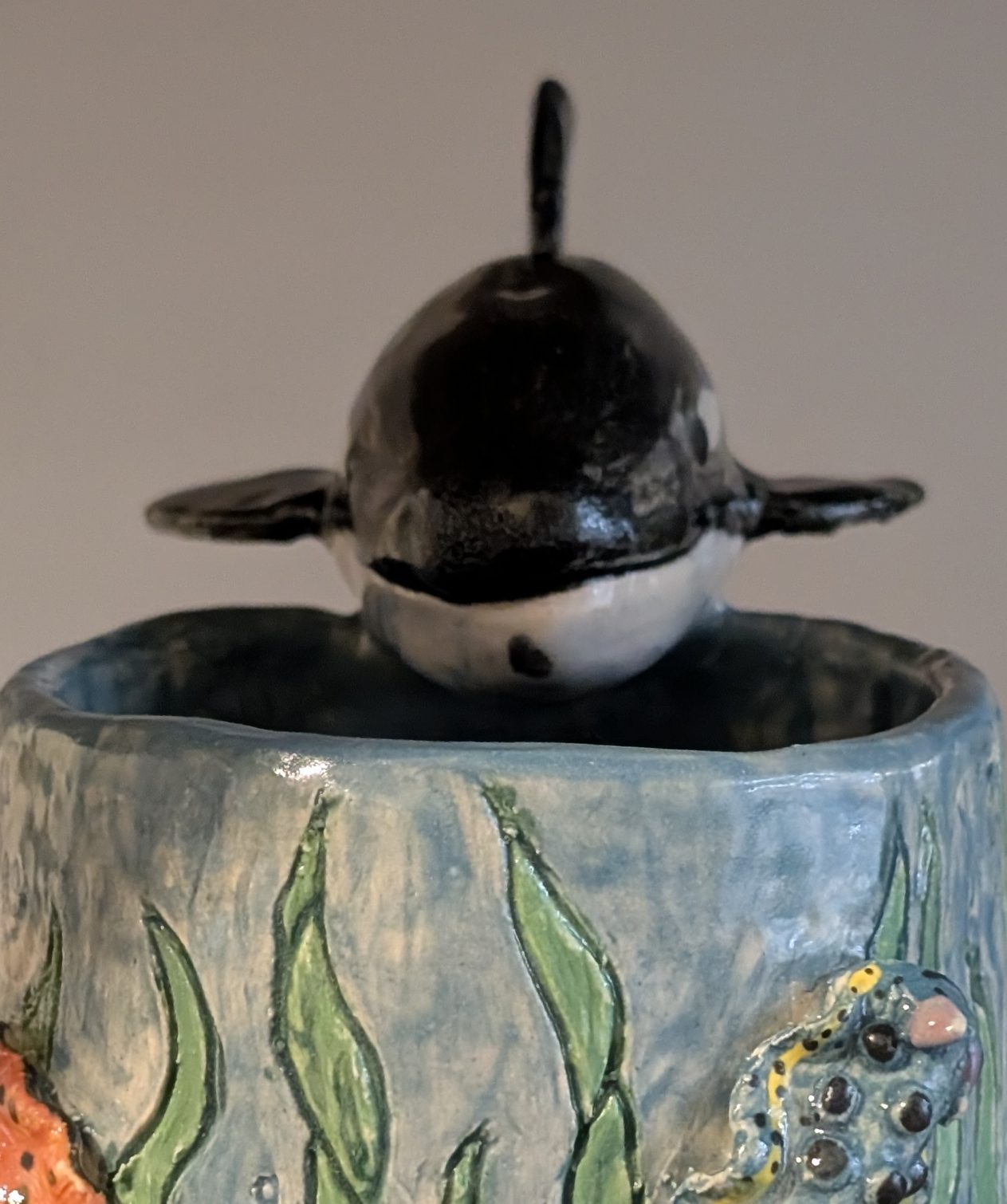 Dive into the ocean with every sip. This mug is a miniature seascape, where waves ripple around the base, seaweed, nudibranchs, clams, and bubbles dance along the sides, and a baby orca rests at the bottom, waiting to be discovered. The handle, shaped as the adult orca in a graceful diving arc, leans protectively over its calf, completing the scene with natural elegance and playful motion. Orca’s Ocean is more than a mug—it’s a tactile, intimate encounter with life beneath the waves.