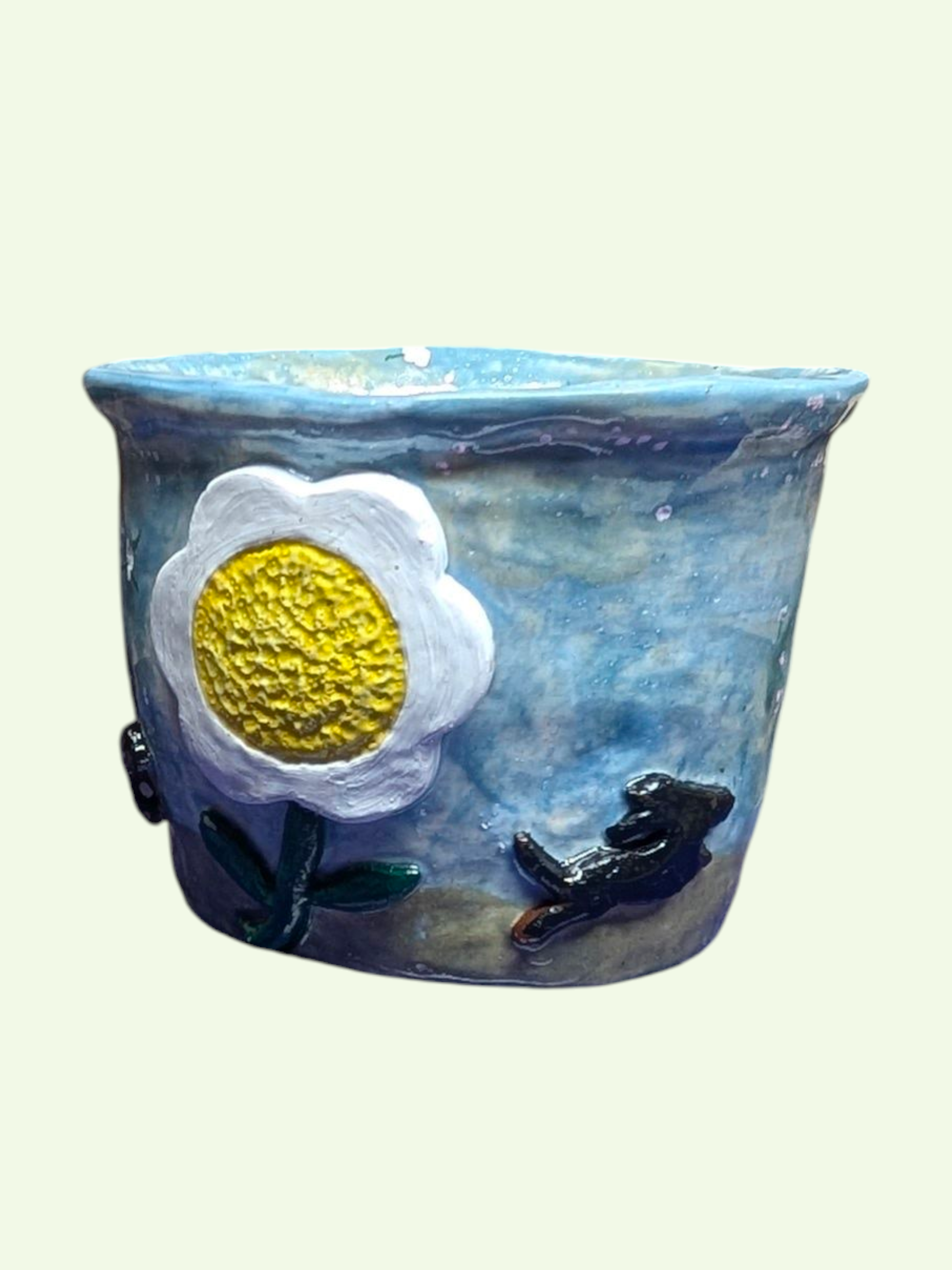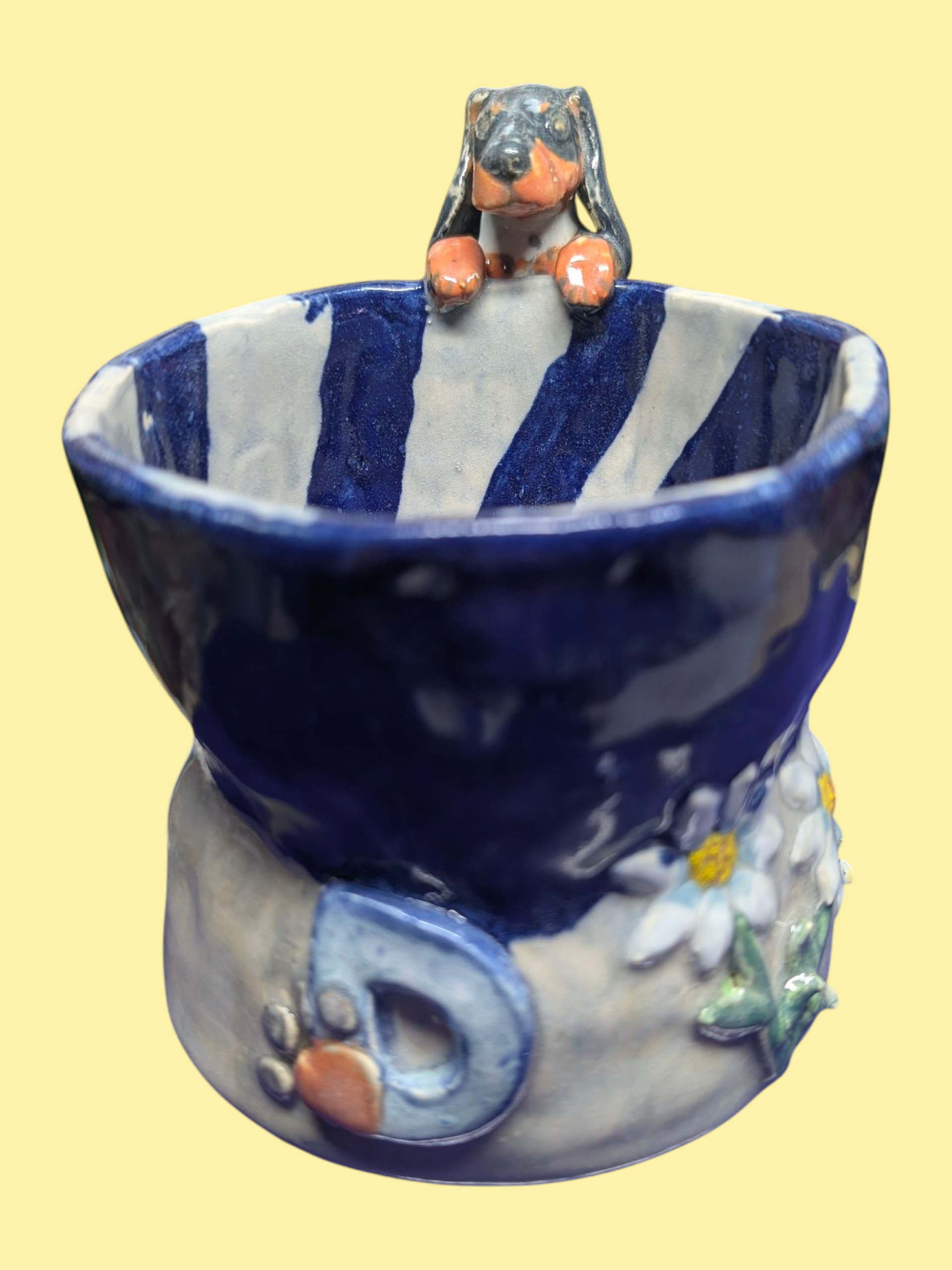 A planter with personality, featuring Raffles in mid-adventure—his back feet braced on the side as his front paws hook over the rim, peeking playfully into your greenery. The planter’s exterior is a soothing blue on the top half, white below, with the interior striped in blue and white, echoing the fresh, uplifting spirit of the piece. On the opposite side, a subtle “D” with a pawprint and delicate, lifted daisies add tactile detail and charm. Raffles’ Climb is a joyful celebration of curiosity, texture, and a cat’s indomitable spirit—already in the perfect home, bringing life and laughter wherever it sits.