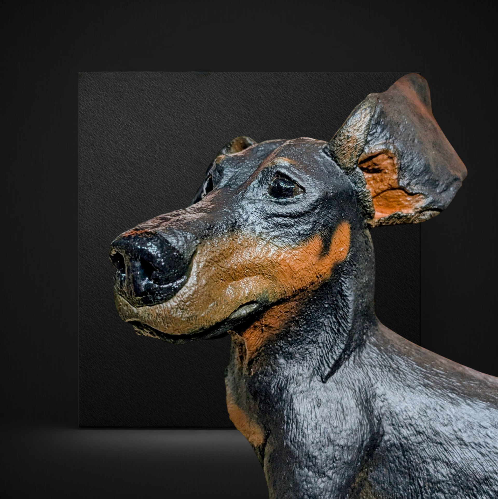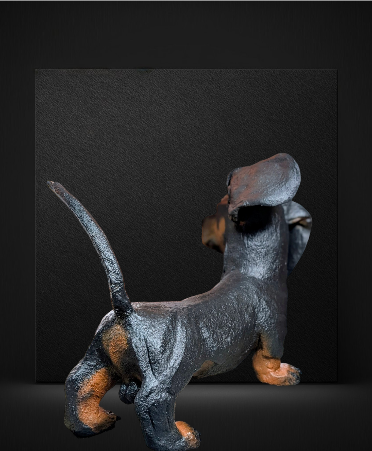 This piece is of a miniature dachshund, smooth coat, hand sculpted by Dee. He has been glazed and then finished with a coat of airbrushing to add a natural soft look to his face.